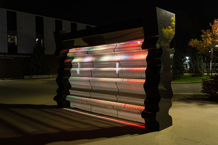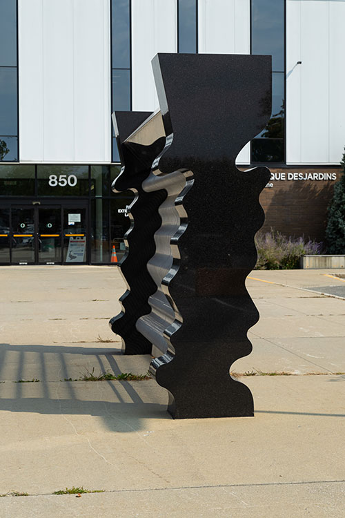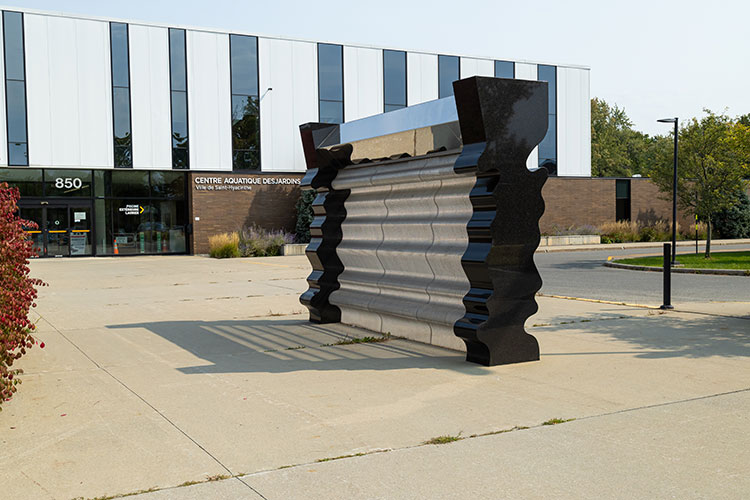 Une sculpture de granit et d’acier, inspirée des jeux de reflets à la surface de l’eau et du tracé de la rivière Yamaska, étonnamment fluide pour sa matérialité.