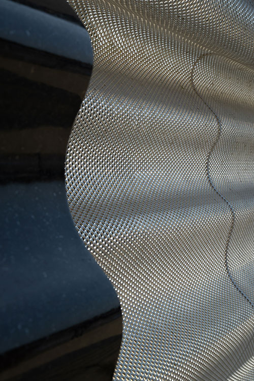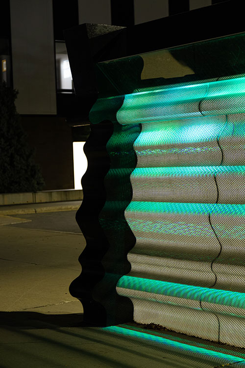 Pour créer sa sculpture réalisée dans le cadre du programme d’art public, l’artiste Marie-France Brière s’est inspirée de l’eau, des jeux de reflets à la surface de l’eau, des miroitements d’une rivière, de l’illusion distordue d’un objet à moitié submergé dans l’eau. Pour la partie centrale de l’œuvre, elle a choisi une feuille d’acier ondulée et trouée pour accentuer le scintillement des jeux de lumière dissimulés dans la « tête » de la sculpture. Cet effet est particulièrement saisissant à la tombée du jour, lorsque les couleurs se fondent sur le noir du granit poli qui retient l’ensemble de l’œuvre.