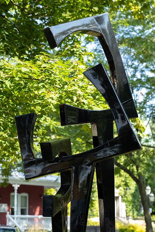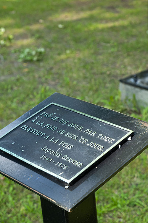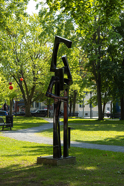 Parmi les arbres du parc Casimir-Dessaulles, se dresse la sculpture hommage au poète et artiste multidisciplinaire maskoutain Jacques Bernier décédé prématurément d’une maladie dégénérative.