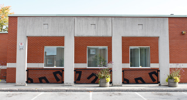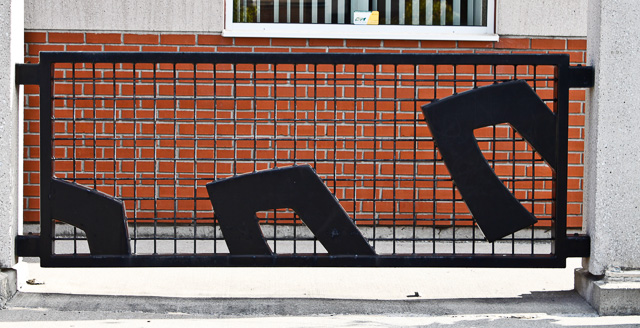 Six modules d’acier peint monochromes sont insérés dans les arches de béton faisant office de pare-soleil. Les motifs intégrés au grillage évoquent des lettres attachées en mouvement.