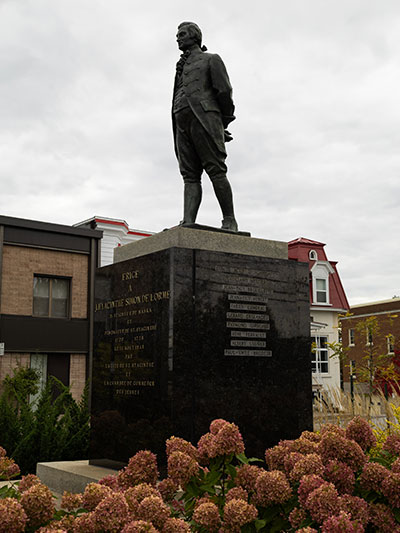 Sise au milieu d’un parc homonyme, la statue s’élève sur une base de granit noire, le regard vers l’est, vers le jour levant, les mains jointes dans le dos. On imagine le maître des lieux se promenant sur sa propriété, fier, racontant comment et où il avait d’abord envisagé de fonder sa seigneurie avant de remonter le courant de la Yamaska, près de la cascade, où le fort débit alimentait mieux les moulins. Il y a d’ailleurs un modeste monument au Rapide-Plat commémorant les débuts de la seigneurie Maska.