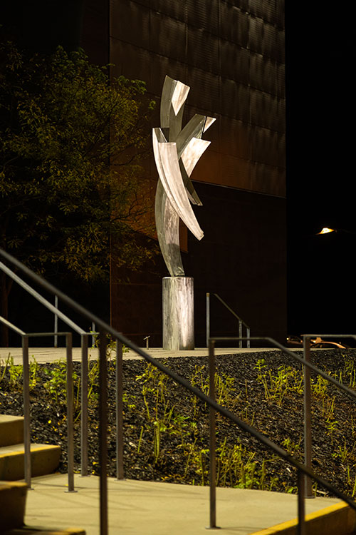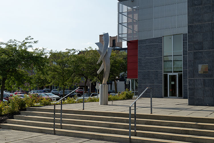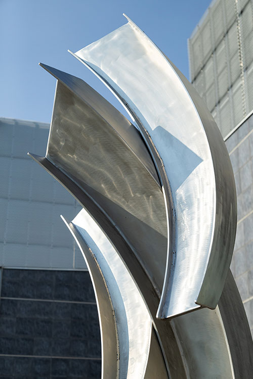 Pas d’acier corten ici, rien ne doit ternir la mémoire des étoiles passées. L’acier inoxydable choisi par l’artiste rappelle le brillant des perséides et s’intègre à la finition argentée du centre des arts Juliette-Lassonde, réalisation de la firme Dan Sergiu Hanganu architectes à qui l’on doit, entre autres, le Musée Pointe-à-Callières et la rénovation, en 1997, du Théâtre du Nouveau Monde, à Montréal. Les trois éléments sculpturaux courbes de l’œuvre, signature du travail de Millette, comme trois arcs bandés, créent une tension avec le bâti rectiligne du centre.