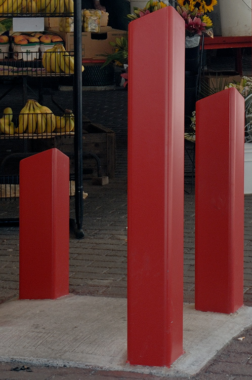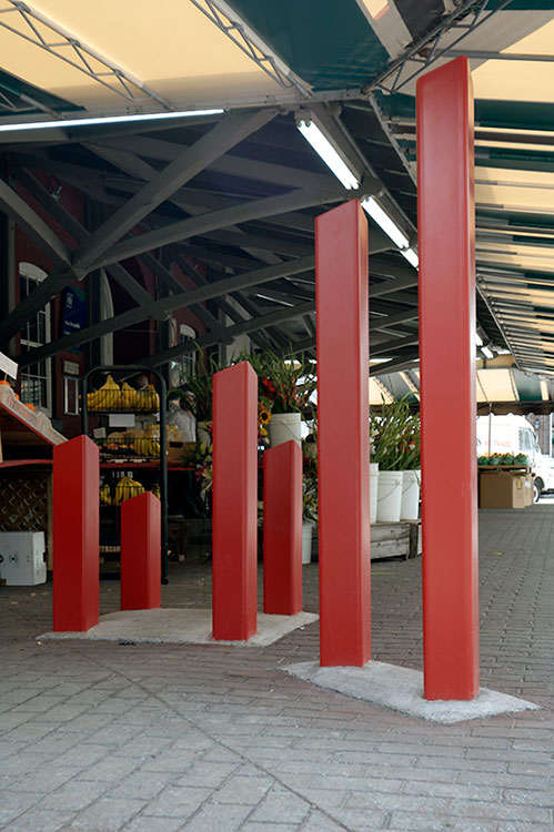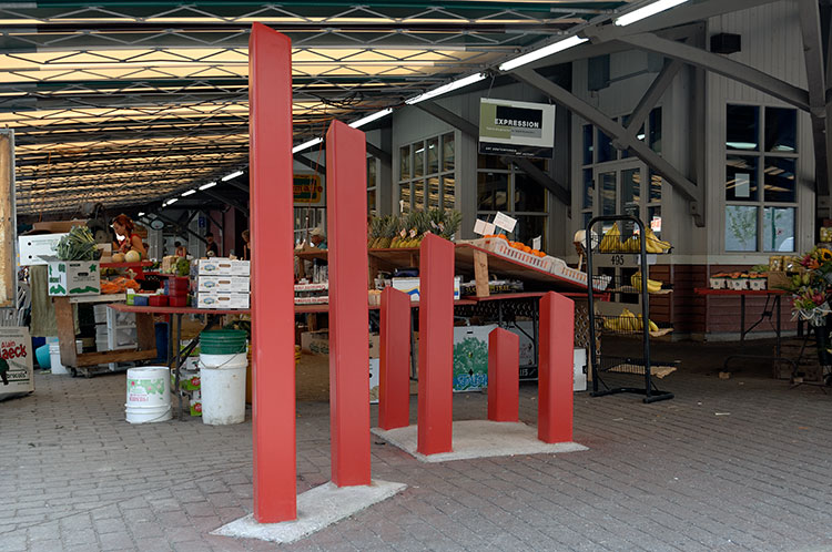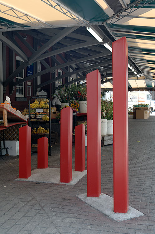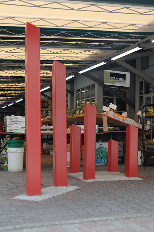 Aujourd’hui entreposé, cet ensemble sculptural signalétique représente une flèche pour orienter les visiteurs vers l’entrée d’EXPRESSION, Centre d’exposition. Les modules en tube d’acier carré érigés à la verticale symbolisent un rassemblent d’individus, adultes et enfants.
