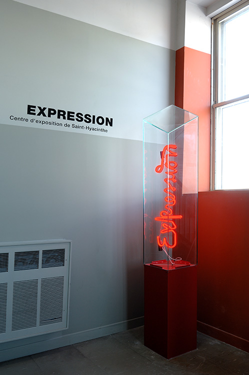 La couleur et les éléments formels de cette composition ont été associés de façon à stimuler l’intérêt, la curiosité du public pour EXPRESSION, le Centre d’exposition de Saint-Hyacinthe. Le rouge a été choisi comme couleur dominante, car il est reconnu que cette teinte est la première couleur perçue par l’œil, et, par conséquent l’une des plus propices à l’éveil de l’attention. La rythmique de cette composition, ainsi que la coupe en diagonale des modules, créent une dynamique sur un axe directionnel en flèche qui oriente le public vers l’entrée de la galerie.