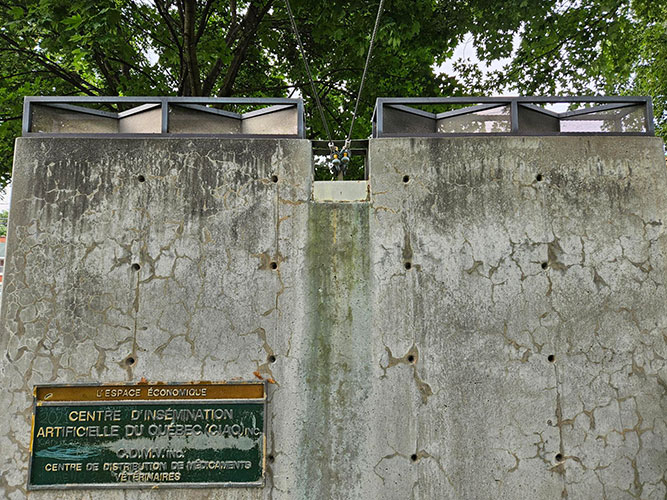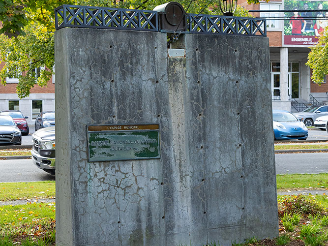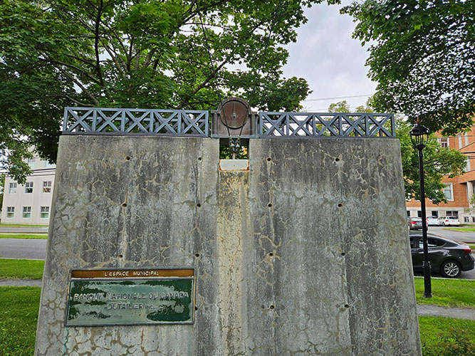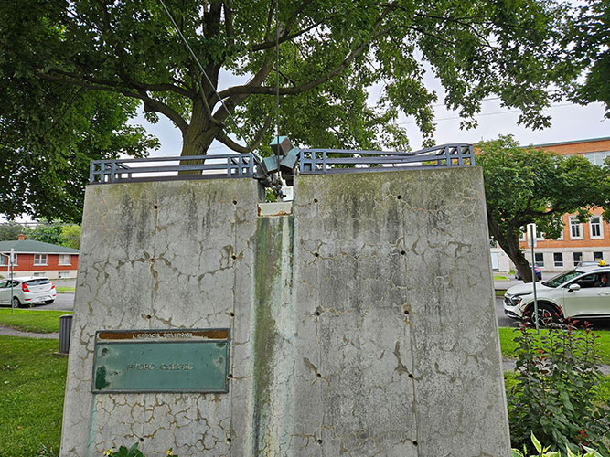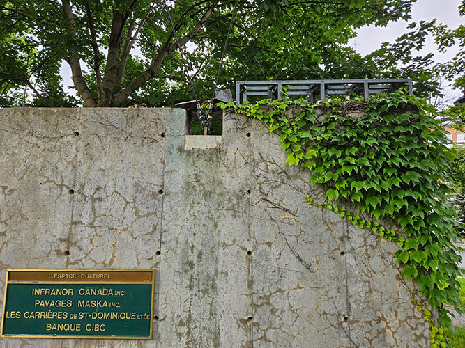 Douze petits bronzes couronnent ces stèles. Mauvais choix de temps de verbe. Il faudrait dire « couronnaient ». Douze petits bronzes les couronnaient. Le temps, les intempéries, la végétation, la négligence, le vol et le vandalisme ont depuis « décimé » les œuvres. Sur les douze œuvres réalisées au début des années 1990, il n’en reste qu’une poignée. Chaque « tête » de stèle comportait une structure, comme un pont, et, au milieu de la crête, un « cœur » faisant écho à un espace. Par exemple, à l’espace municipal, un cadran d’horloge; à l’espace géographique, une cascade; à l’espace politique, quelques cubes, ressemblant à des dés jetés au hasard, par chance s’y trouvent encore.