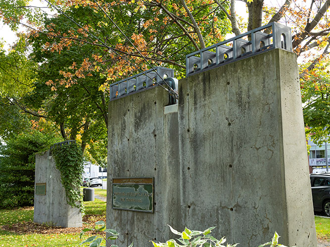 Douze petits « ponts » uniques en bronze surplombant autant de stèles en bétons de l’Espace maskoutain.