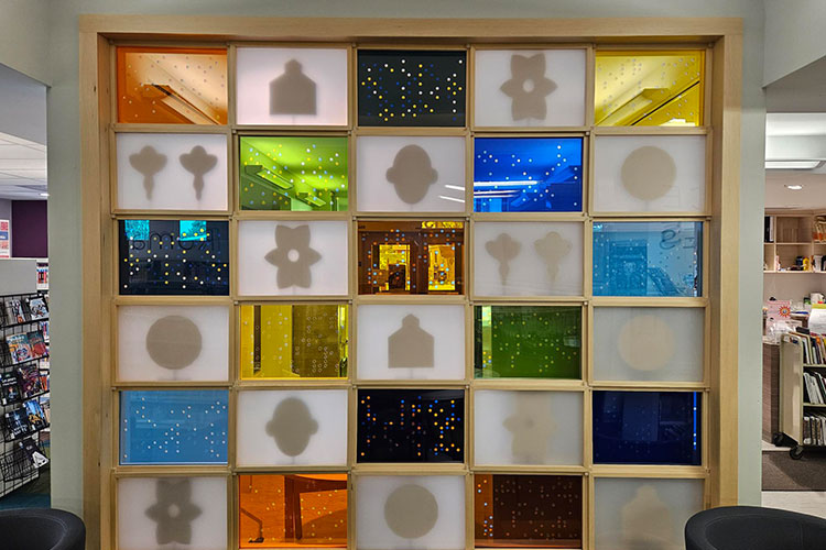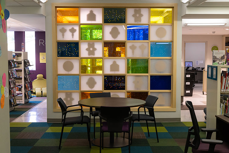 Consciente ou non de faire un pied de nez à cet aménagement, l’artiste Louise deLorme, invitée en 1994 à créer une œuvre d’art public, a décidé de l’intégrer aux murs de la bibliothèque. Le support de son œuvre est un mur. L’œuvre est un mur. Imposante et discrète à la fois, elle nous accueille à l’entrée de la bibliothèque avec ses six mètres carrés. Un pan de mur coloré !