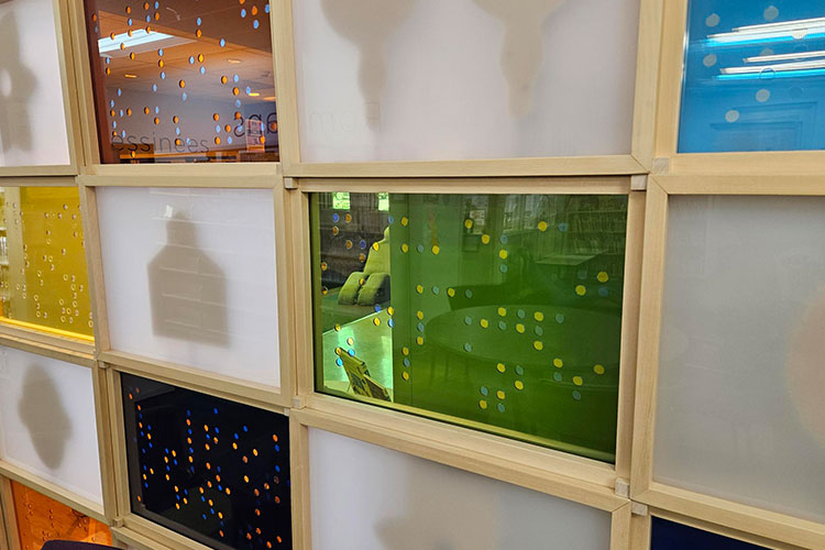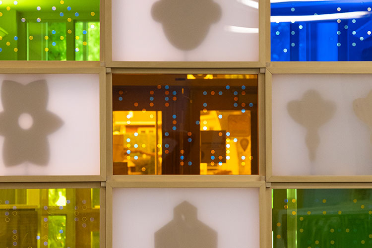 L’artiste a choisi quatre couleurs pour ces feuilles : vert, jaune orangé, bleu et ambre ; une pour chaque saison (été, automne, hiver, printemps). Ces feuilles colorées, elle les a agencées afin de pouvoir créer des couleurs secondaires qui exprimaient à leur tour l’éventail des « entre-saisons » et du temps qui passe, un peu comme un calendrier. Colorées, mais translucides, elles laissent passer la lumière et permettent donc d’apprécier l’œuvre d’un côté comme de l’autre.